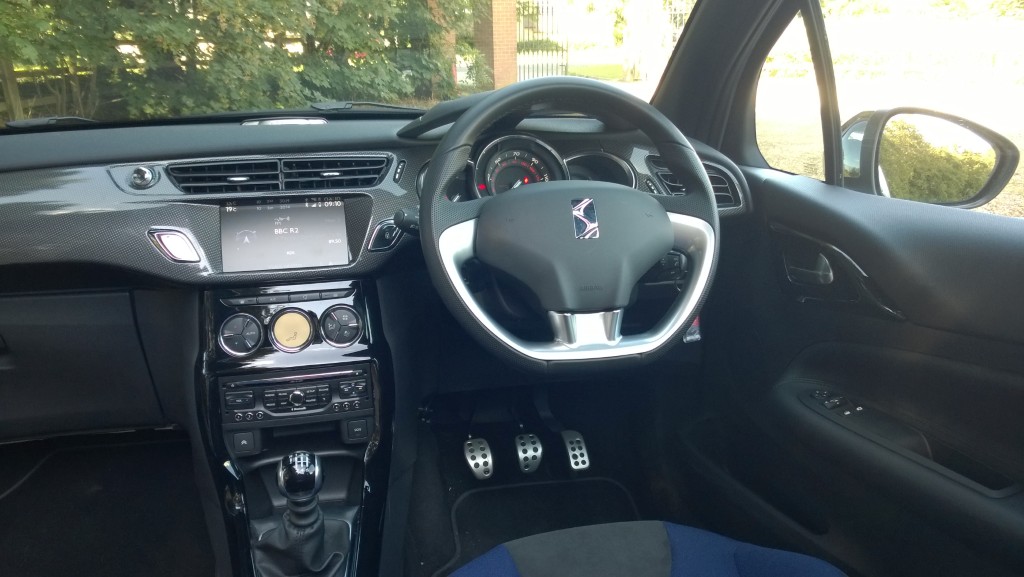 For a shade under £20,000 the DSport you see here comes with a lot of toys. Digital climate control, tinted windows, electric door mirrors, electric windows, cruise control, a leather steering wheel, carbon fibre effect dashboard, aluminium pedals and a CD stereo with steering-wheel-mounted controls plus Bluetooth and USB connection all come as standard. On the outside, the DS3 comes with chrome door handles and door strips, front LED daytime running lights, fog lights, 17 inch alloy wheels, roof-coloured door mirrors, two-tone body and roof colours, tinted rear windows, an alarm, rear spoiler and double chrome exhausts.